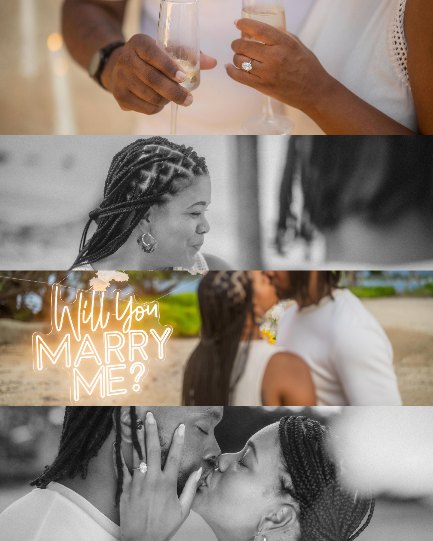 As the proposal date approached, Myron decided to elevate the experience by adding a decorative element to the setup. I recommended a few local planners and decorators I often collaborate with, and he chose to work with Katherinne Moreira, founder of I Do Proposals, an emerging proposal planning company in Puerto Rico. Katherinne’s design vision for the moment was stunning: a white arch in the shape of a heart, soft yellow petals scattered on the ground, and bright sunflowers interwoven throughout the structure. The result was a scene that felt intimate, elegant, and full of joy—just like Myron and Devon’s story.