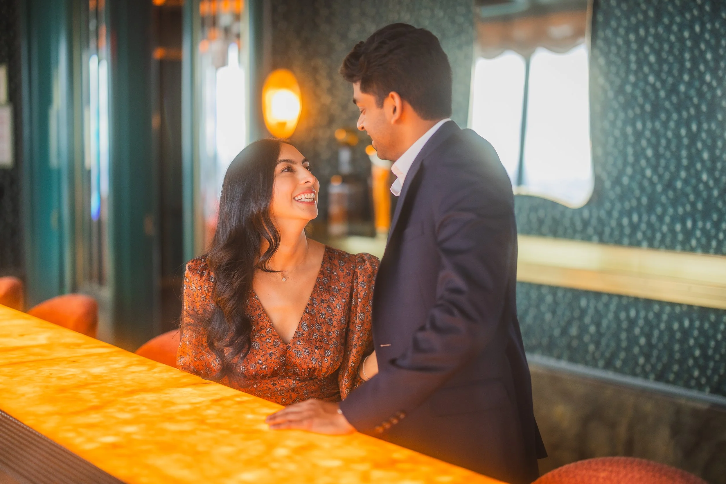 Nubeluz is riddled with lovely scenes to take advantage of from lavish seating booths to wonderful couches overlooking that Manhattan skyline. The floor to ceiling windows allow for an extraordinary amount of natural light to make its way into the bar/restaurant and I made sure to use it to my advantage at all times. It made life easy in the sense that I could could have a great balance of shots of Alysha and Justin both sitting down and either leaning on the bar or standing up for an environmental portrait. The venue really brought out the atmosphere of the occasion and I think it paired well with the overall aesthetic that Justin had envisioned even before picking my brain as a professional photographer.